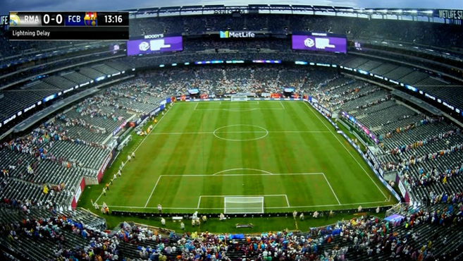 El partido entre el Real Madrid y el FC Barcelona fue suspendido por riesgo de tormenta elctrica en el minuto 11:35 de encuentro. En ese momento tal amenaza no pareca evidente, pero minutos despus la descarga elctrica hizo presencia en el MetLife Stadium.