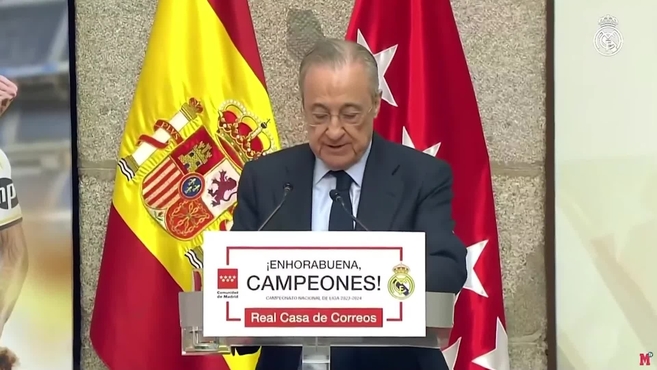 Florentino Prez habl en la Real Casa de Correos para dar las gracias a Isabel Daz Ayuso por la recepcin en el Ayuntamiento y a los jugadores por el esfuerzo para firmar una de las mejores temporadas de la historia. No ocult el presidente la admiracin por una plantilla que «ha superado todos los obstculos» y que ya suea con la Decimoquinta. «Nos vamos a dejar el alma para volver a traerla aqu», dijo el presidente, que regal a la presidenta de la Comunidad una rplica de la copa de LaLiga, una camiseta firmada por toda la plantilla y otra camiseta con su nombre en la espalda.
