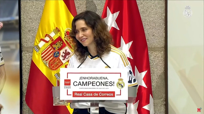 Isabel Daz Ayuso recibi al Real Madrid en la sede de la Comunidad con una sudadera del equipo blanco y con el discurso ms madridista de todos los que ha protagonizado la presidenta, que recibi de manos de Florentino Prez una rplica de la copa de LaLiga y dos camisetas del Madrid, una firmada por toda la plantilla y otra con su nombre. «Recibimos al mejor equipo del mundo, al Real Madrid cada vez ms grande y cada vez ms de moda del extranjero. Esta copa tiene una emocin que lo envuelve todo. El Madrid son muchas cosas, es llevar la marca Madrid y Espaa por todo el mundo. Es llevar la ilusin a los nios de todo el mundo. Es smbolo de xito, los valores de la constancia, es un club alto de miras, aunque a veces provoque recelos».